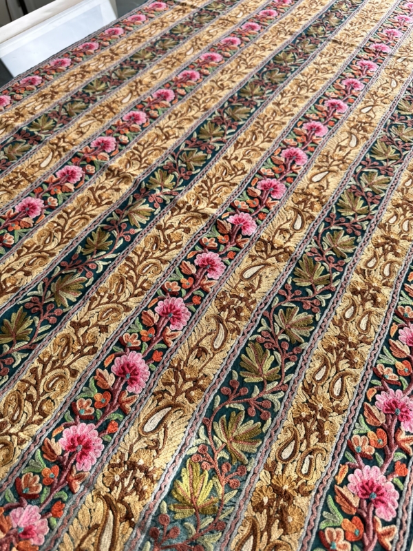 Natural Motifs: Common motifs include flowers, vines, leaves, and paisleys, often inspired by the natural beauty of Kashmir.