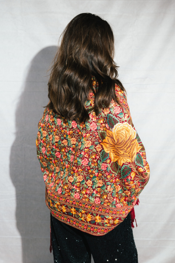 Kashmiri Ari hand embroidery, also known as Kashmiri Crewel embroidery, is a traditional craft from the Kashmir region of India. It involves intricate needlework, typically done with a hooked needle called an “Ari.” The designs often feature natural motifs like flowers, leaves, and paisleys, and are characterized by their fine, detailed, and flowing patterns.