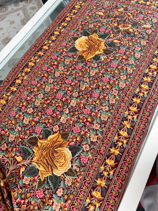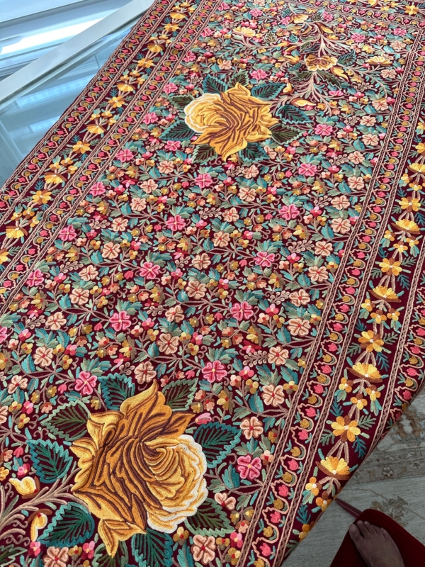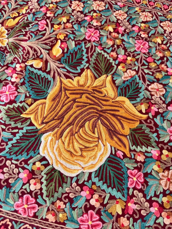 Natural Motifs: Common motifs include flowers, vines, leaves, and paisleys, often inspired by the natural beauty of Kashmir.