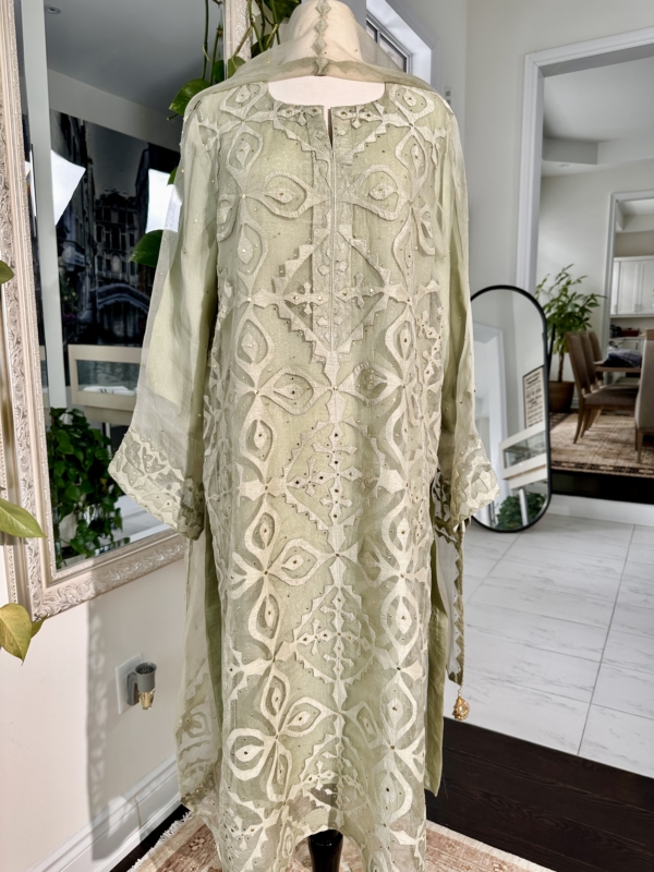 - The dupatta is adorned with mukaish highlights, bordered with patchwork, and complements the kameez.