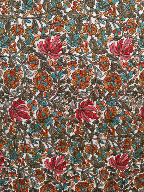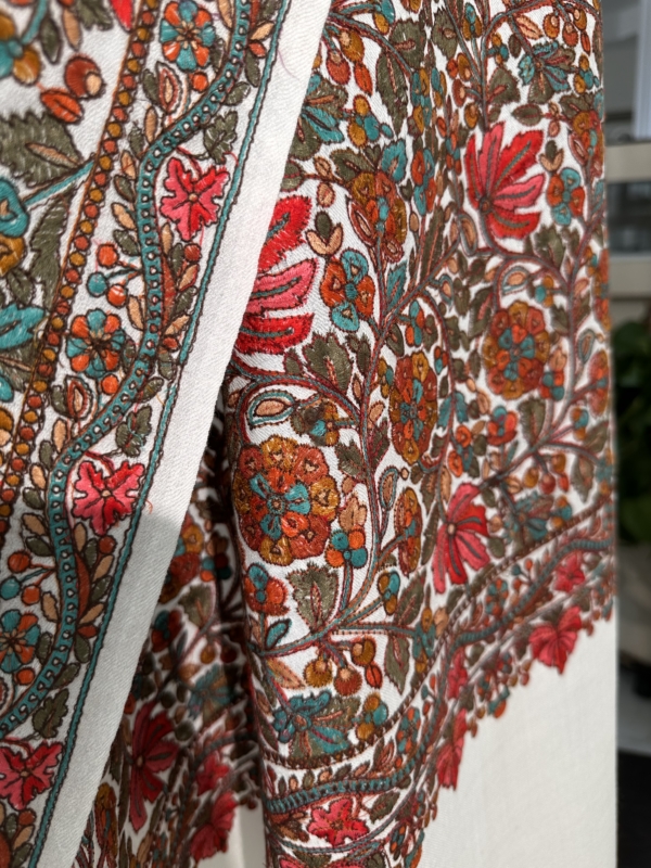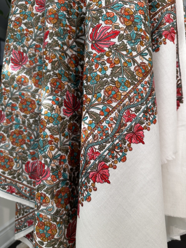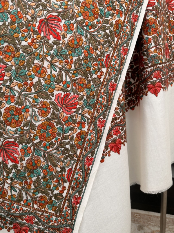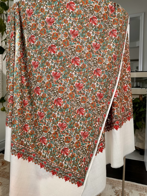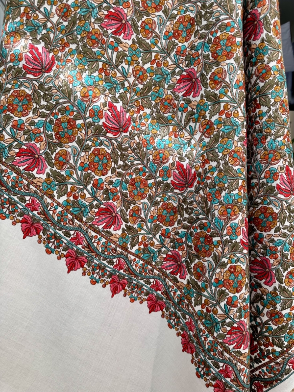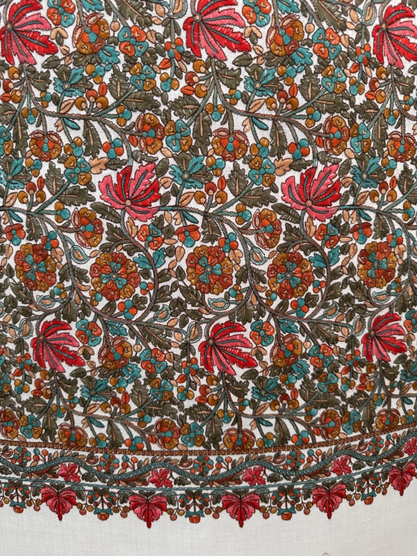 Immerse yourself in the luxurious charm of the Chasm Bulbul Heavy Embroidered Kashmiri Jamma Shawl, a true testament to Kashmiri craftsmanship and heritage. This exquisite shawl is adorned with intricate embroidery, showcasing the traditional Jamma style, where the entire fabric is meticulously covered with elaborate needlework.