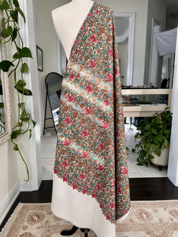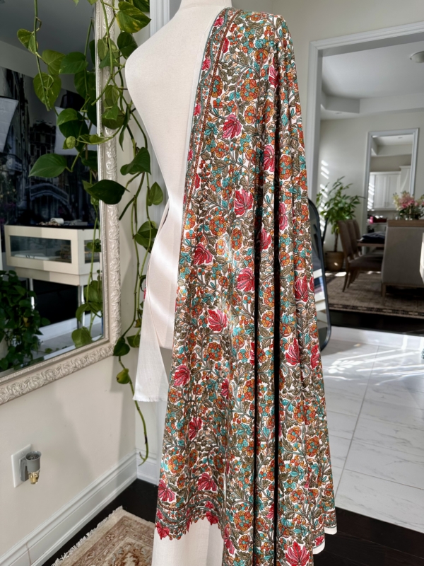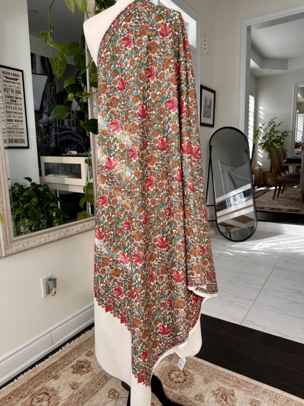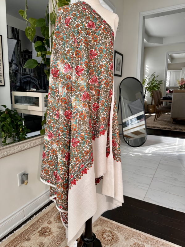 Crafted from the finest Pashmina and wool blend, the shawl exudes warmth, softness, and sophistication. Rich floral patterns, paisley designs, and vibrant hues intertwine to create a breathtaking visual appeal, making this shawl a statement piece for any occasion.