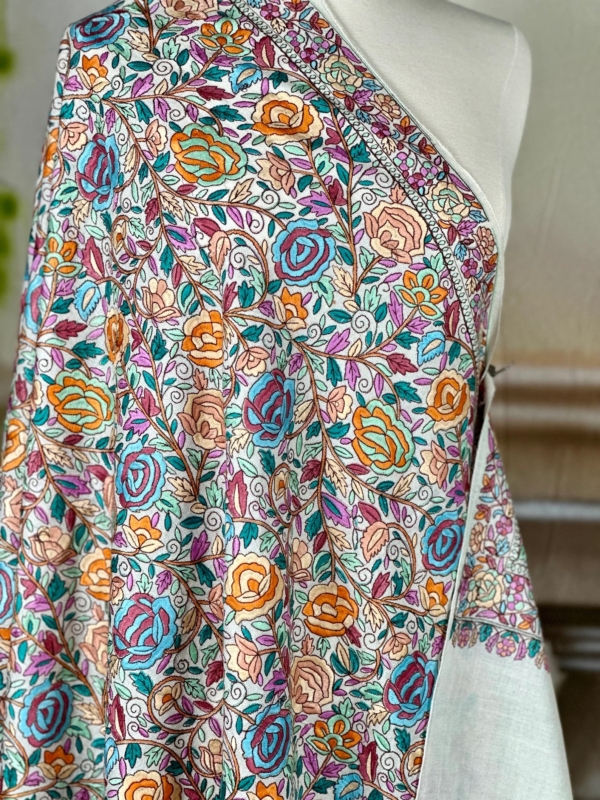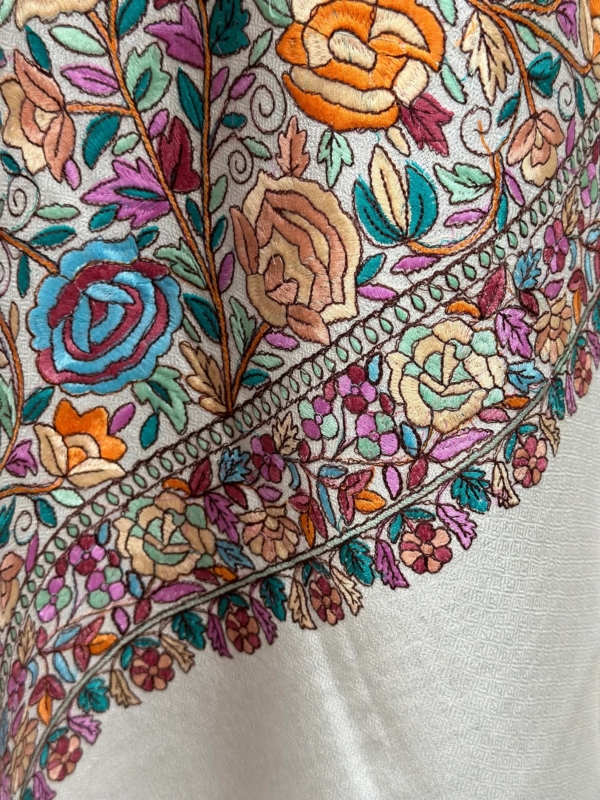 Immerse yourself in the luxurious charm of the Chasm Bulbul Heavy Embroidered Kashmiri Jamma Shawl, a true testament to Kashmiri craftsmanship and heritage. This exquisite shawl is adorned with intricate embroidery, showcasing the traditional Jamma style, where the entire fabric is meticulously covered with elaborate needlework.
