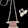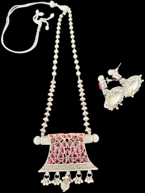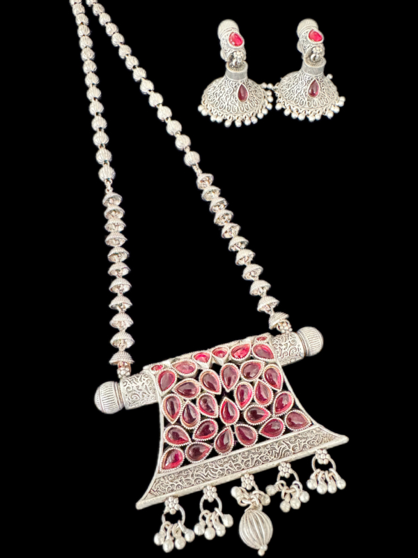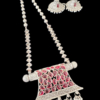 Stunning pure silver necklace set featuring intricate craftsmanship. The necklace includes a long, beaded chain adorned with beautifully detailed silver elements and a rectangular pendant. The pendant is embellished with pink gemstone details arranged in a floral design and intricate engravings. It is finished with dangling silver beads for added elegance. The matching earrings feature a similar intricate design, complementing the necklace perfectly. This set exudes a traditional yet timeless charm.