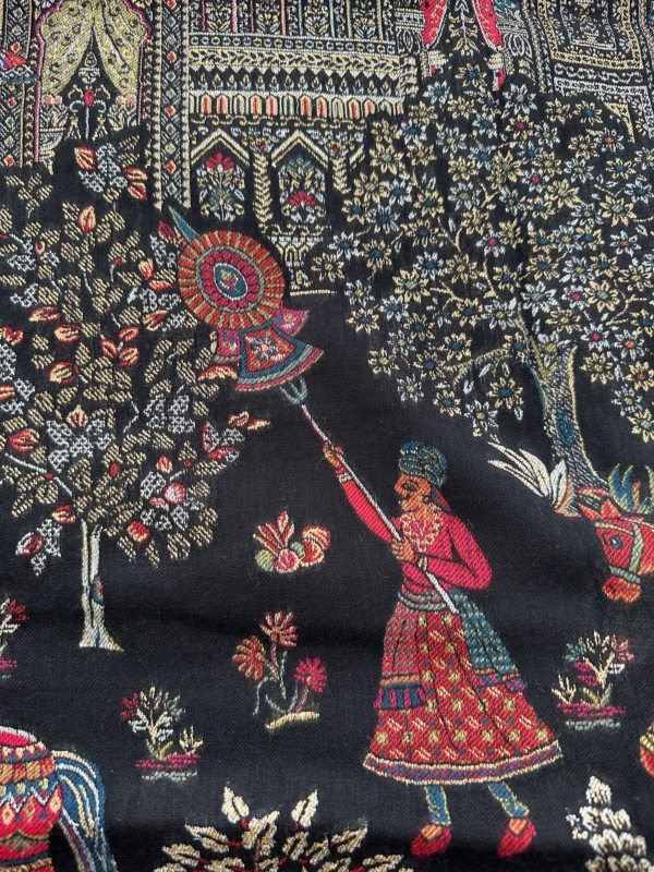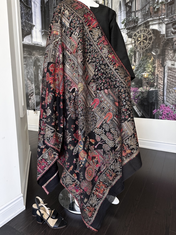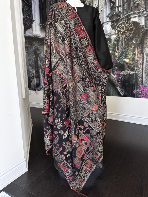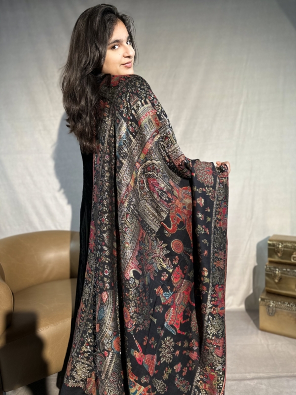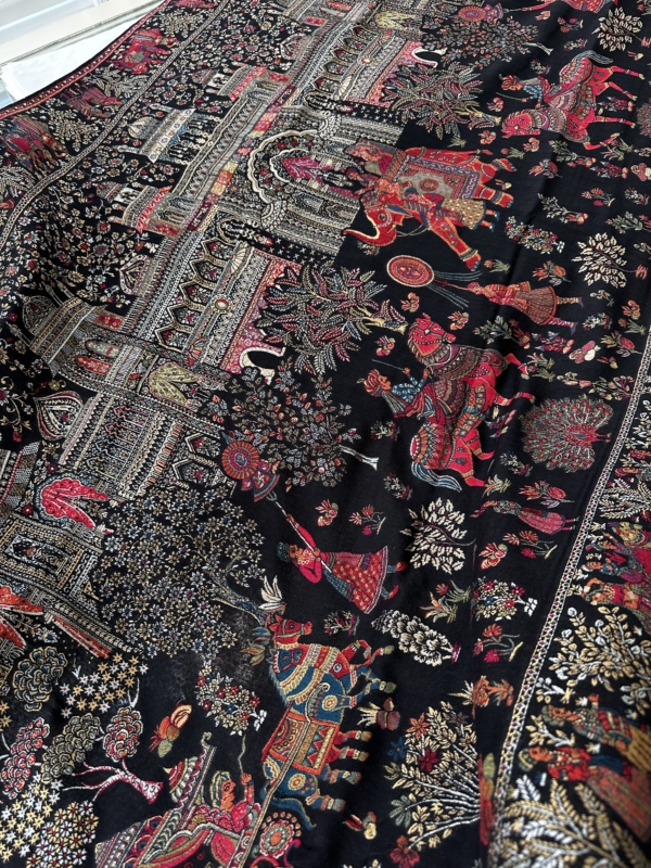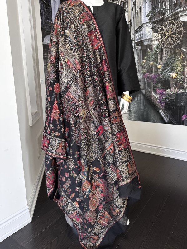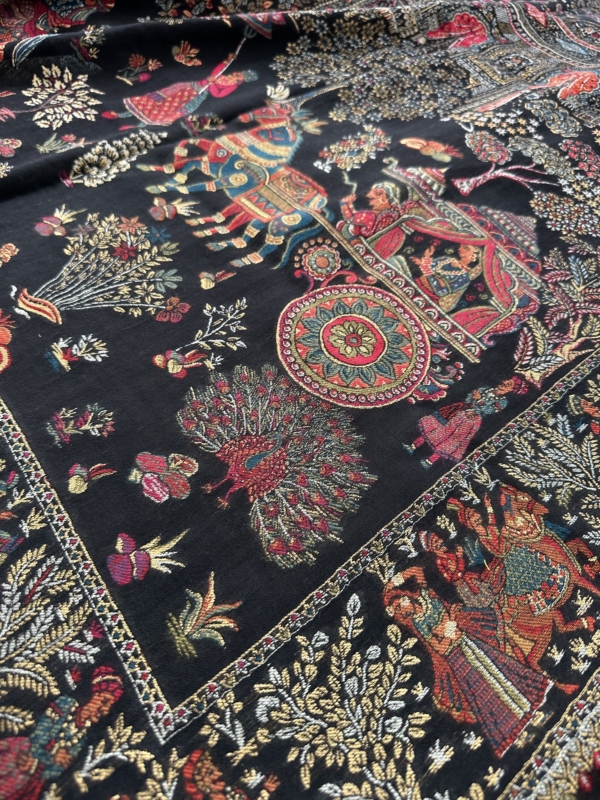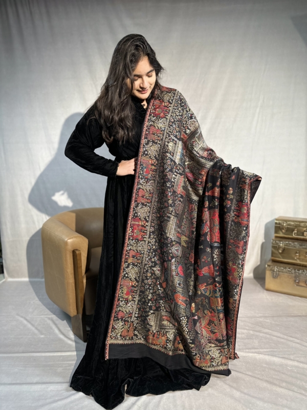Perfect for special occasions or as a collector’s treasure, this shawl is not just a garment — it’s a wearable palace scene, a legacy of luxury, and a tribute to the timeless elegance of Mughal inspiration.
