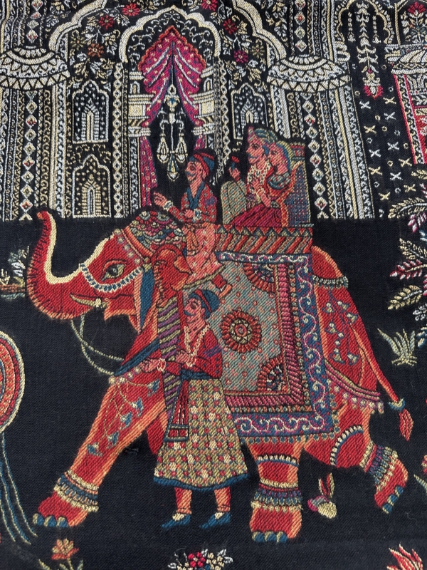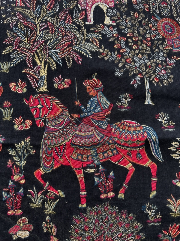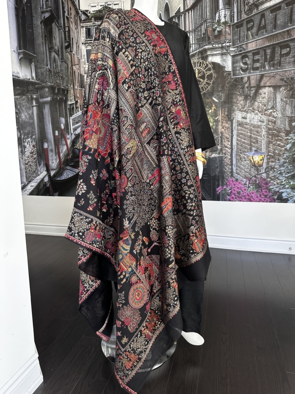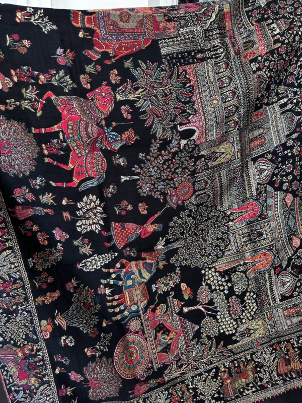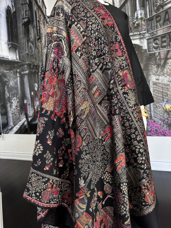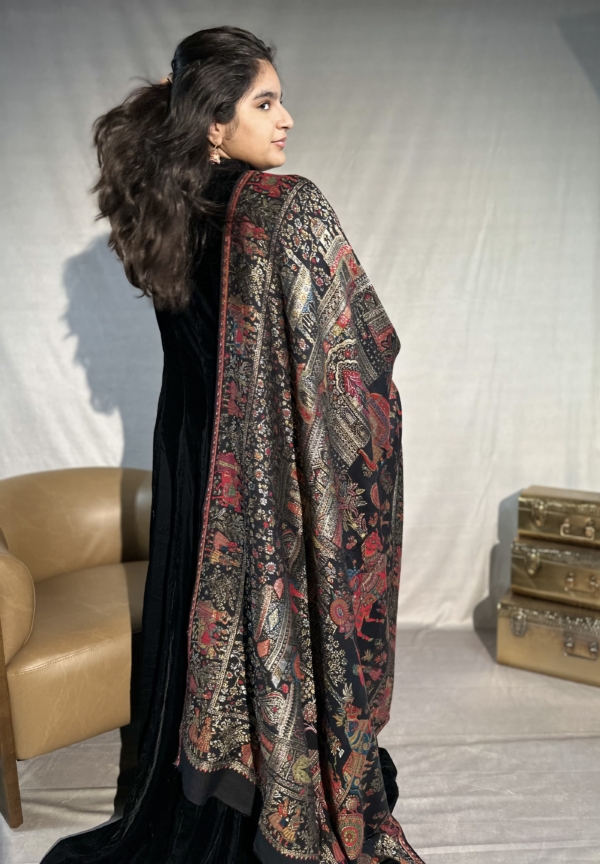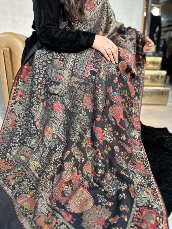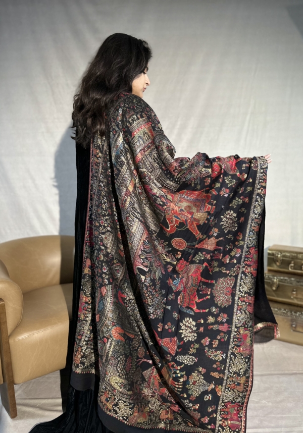Perfect for special occasions or as a collector’s treasure, this shawl is not just a garment — it’s a wearable palace scene, a legacy of luxury, and a tribute to the timeless elegance of Mughal inspiration.