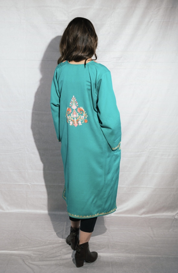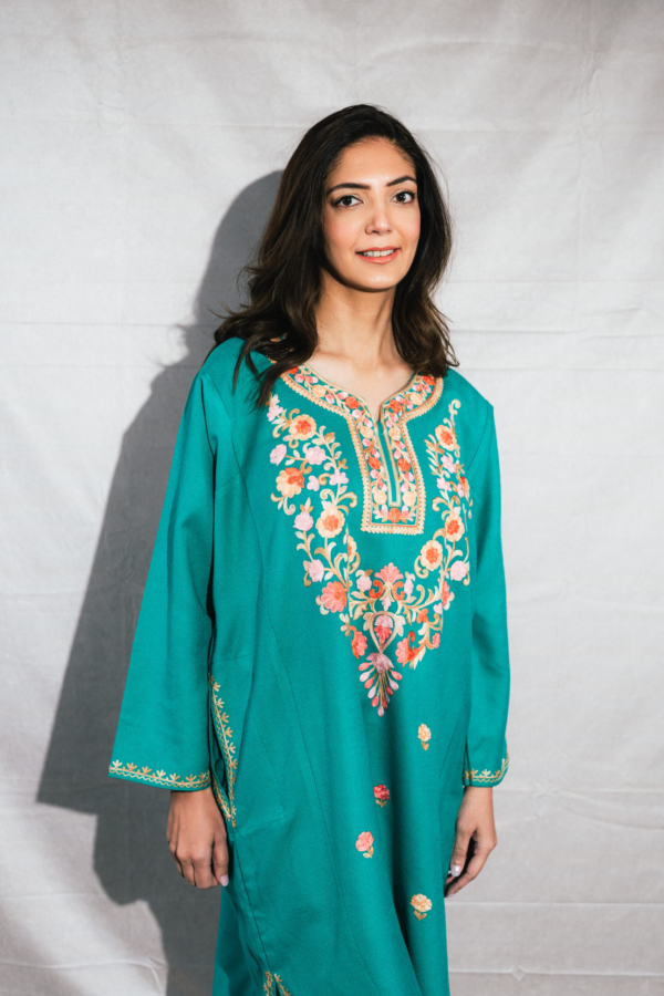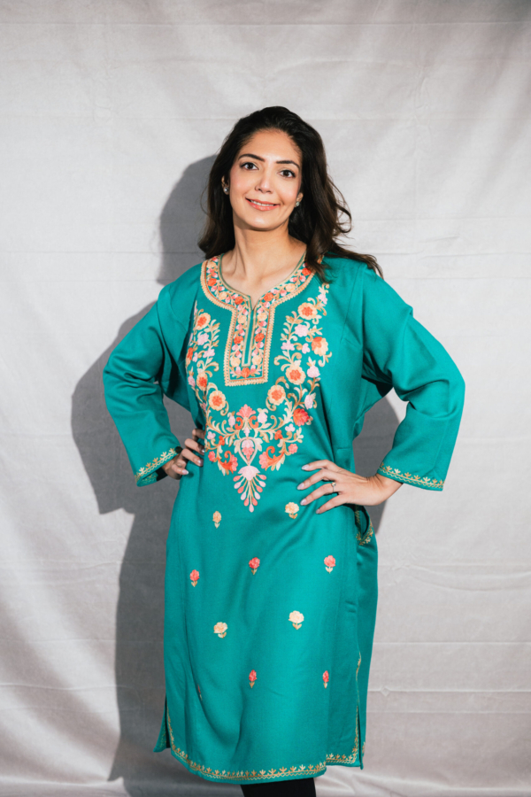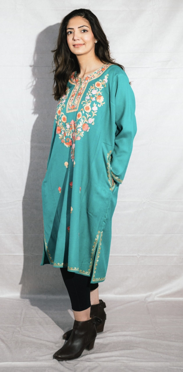 Elevate your winter wardrobe with our traditional Kashmiri Pheran crafted from a mix of wool fabrics, complete with two side pockets and delicate Ari work embroidery. Inspired by centuries of Kashmiri tradition, these Pherans offer both warmth and elegance, perfect for cold weather outings. The intricate till work embroidery adds a touch of sophistication to this timeless garment, making it a must-have for any discerning fashion enthusiast. Stay cozy and stylish with our Kashmiri Pheran, blending tradition with modern flair