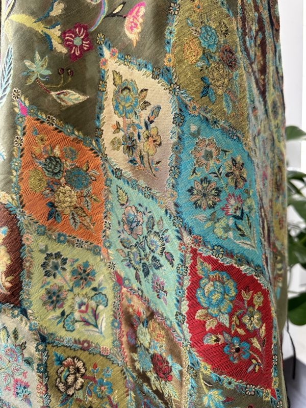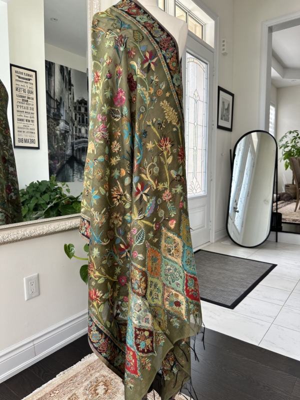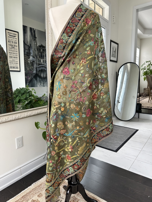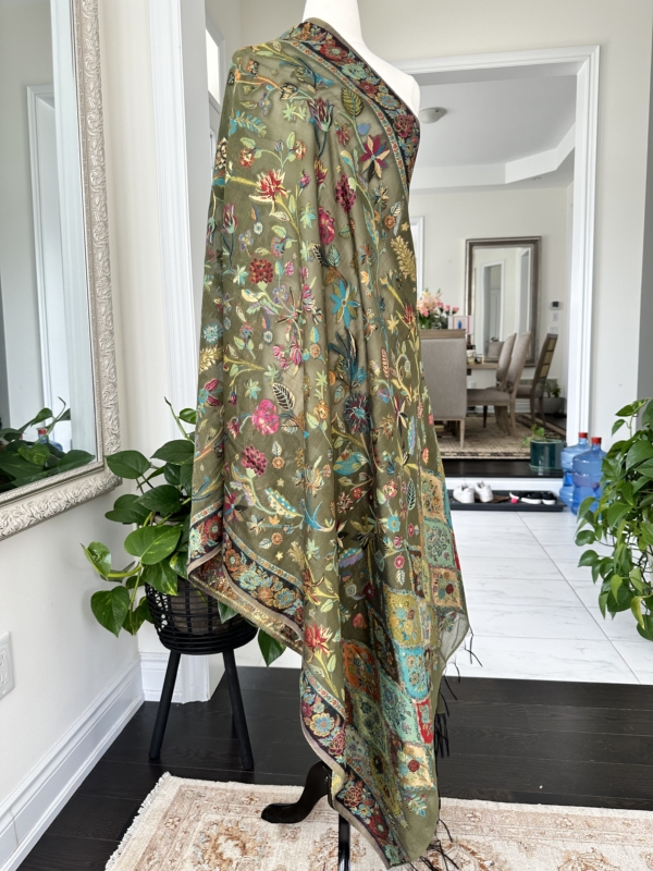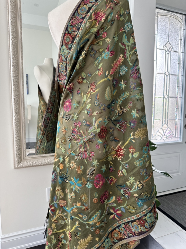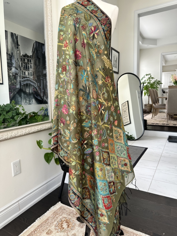 The Kani silk shawl is a testament to timeless elegance. Crafted with the finest silk, this accessory boasts the intricate Kani weaving technique, featuring delicate floral patterns and vibrant hues. Lightweight yet warm, it drapes gracefully, making it a luxurious addition to any ensemble. The traditional craftsmanship and rich texture of the Kani silk shawl exude a touch of regality, making it a perfect blend of cultural heritage and contemporary style.