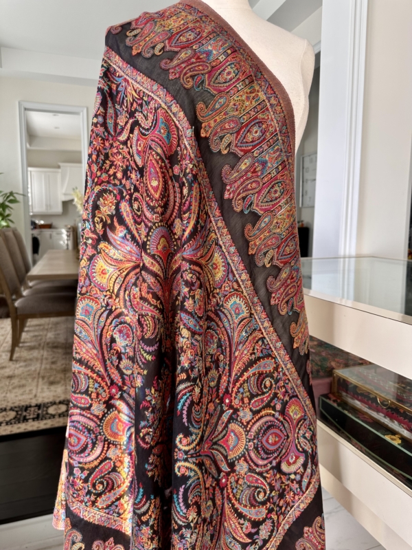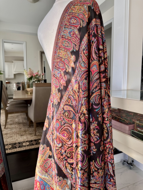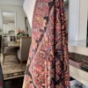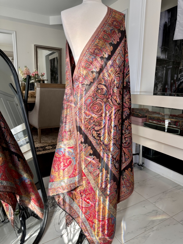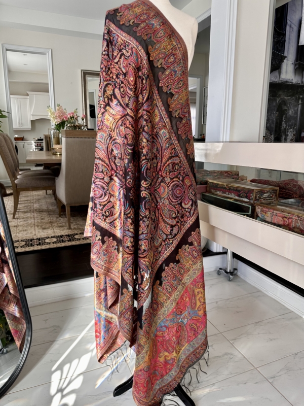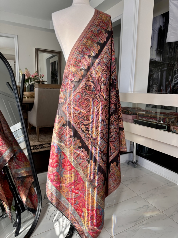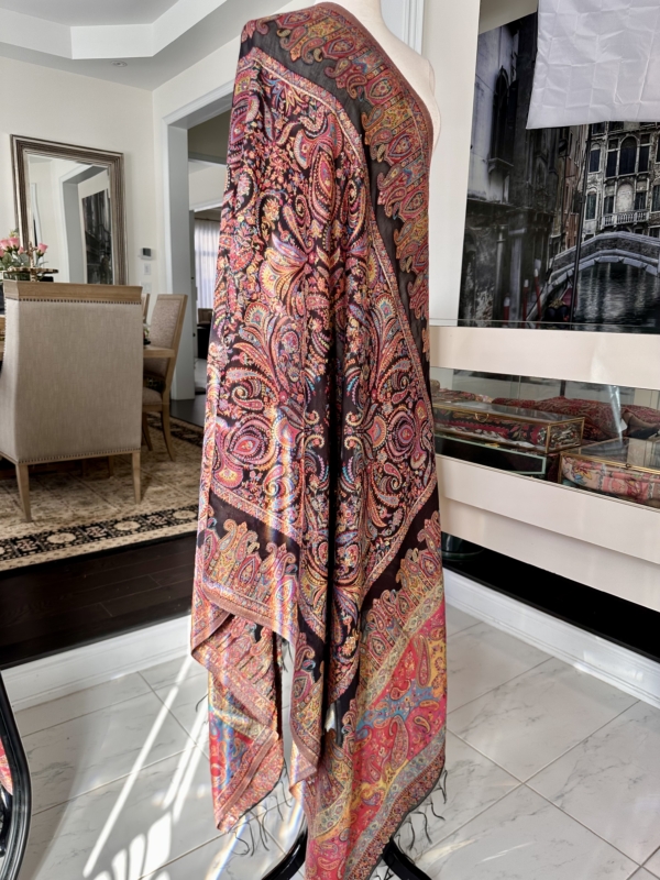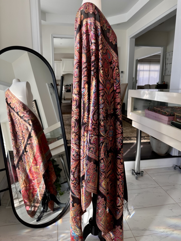 The Kani silk shawl is a testament to timeless elegance. Crafted with the finest silk, this accessory boasts the intricate Kani weaving technique, featuring delicate floral patterns and vibrant hues. Lightweight yet warm, it drapes gracefully, making it a luxurious addition to any ensemble. The traditional craftsmanship and rich texture of the Kani silk shawl exude a touch of regality, making it a perfect blend of cultural heritage and contemporary style.